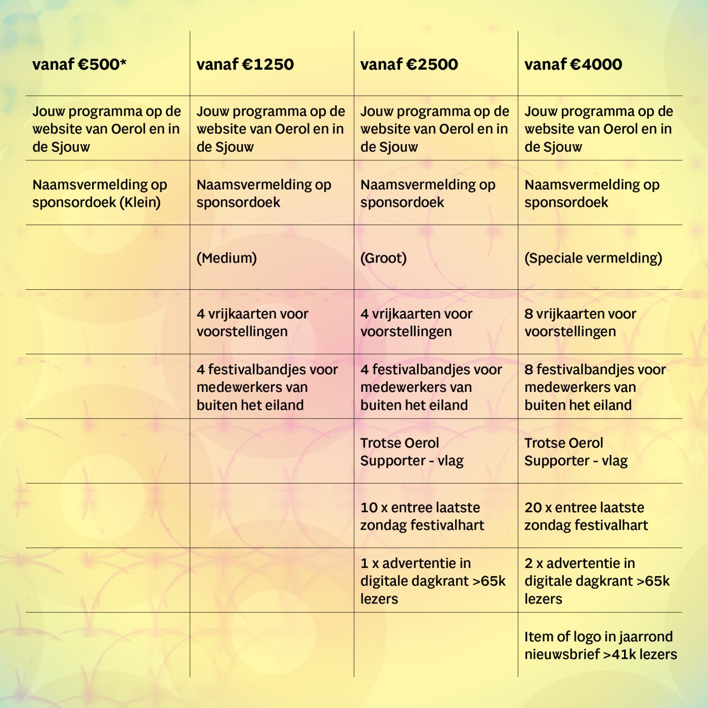 Want to learn more about supporting Oerol with your business? Send an email to steun@oerol.nl or call 0562 448 448.