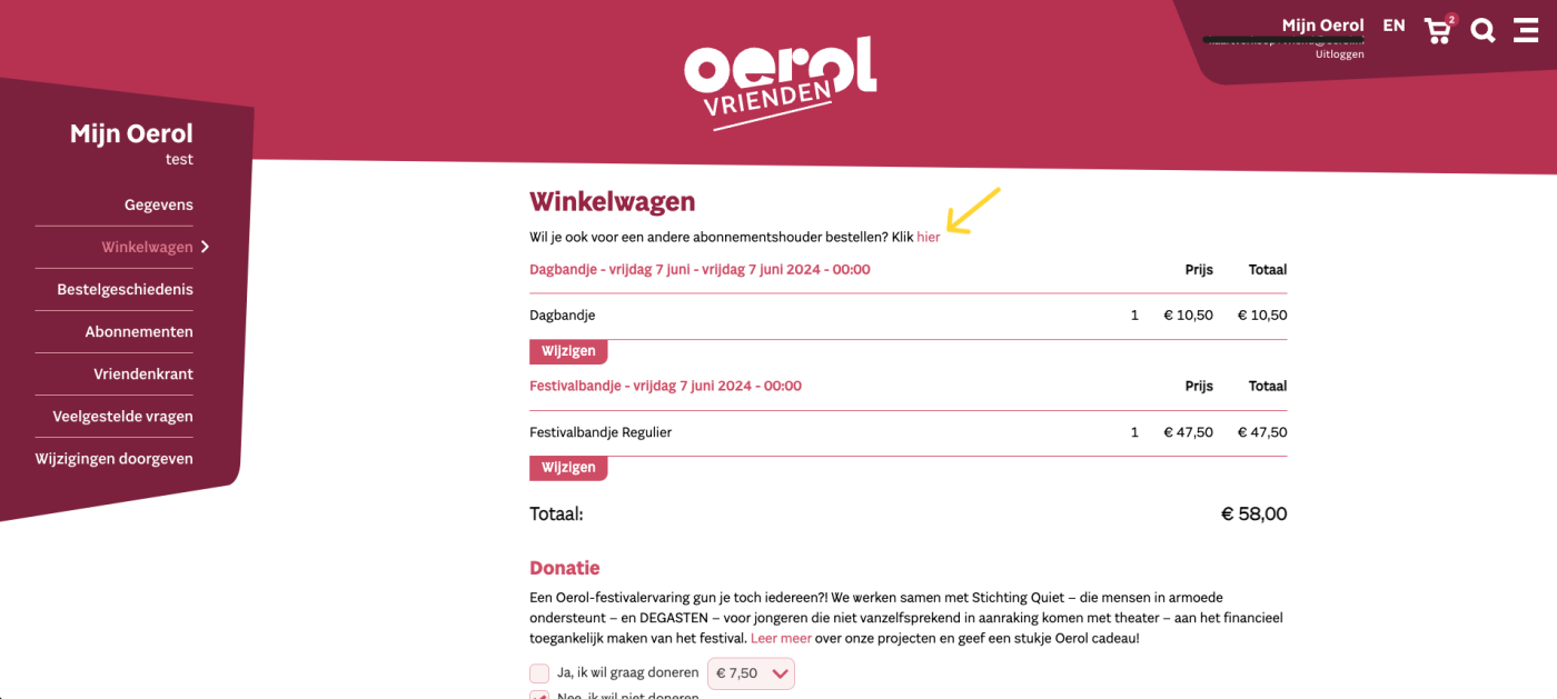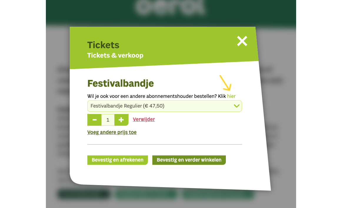 Ook via je winkelwagen kun je voor een andere abonnementhouder bestellen. Je hoeft dit maar op één plek te doen: tijdens het toevoegen van tickets, of dus later in je winkelwagen.