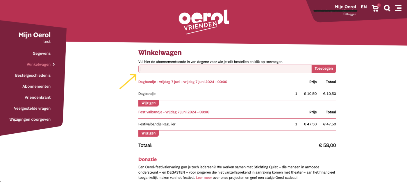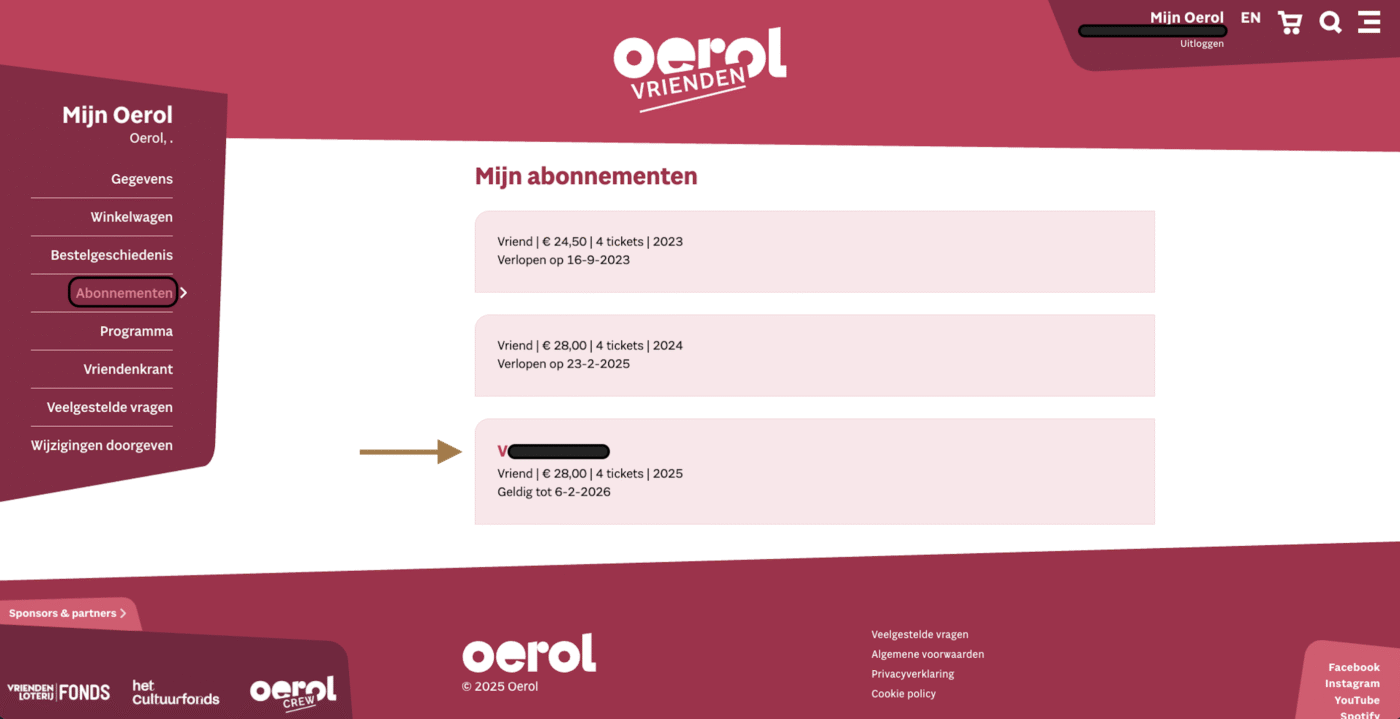 - Klik in het Mijn Oerol-menu links op Abonnementen;