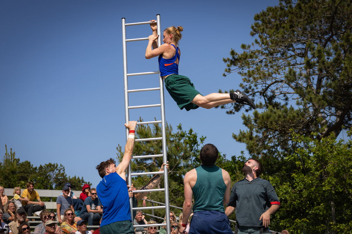 Acrobaten van circuscollectief Hringleikur uit IJsland tijdens hun theatervoorstelling Whatever the Weather tijdens Oerol 2023.