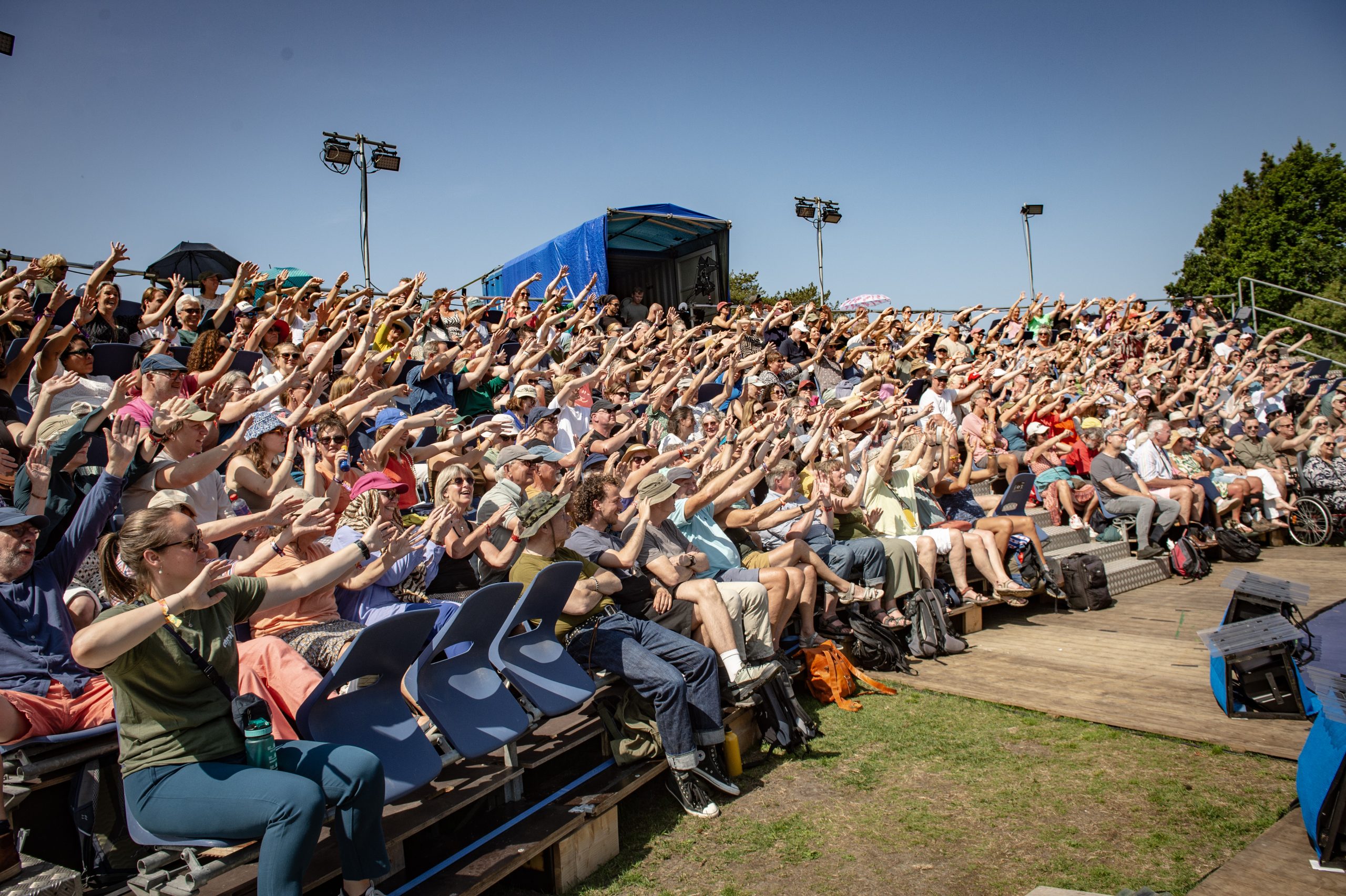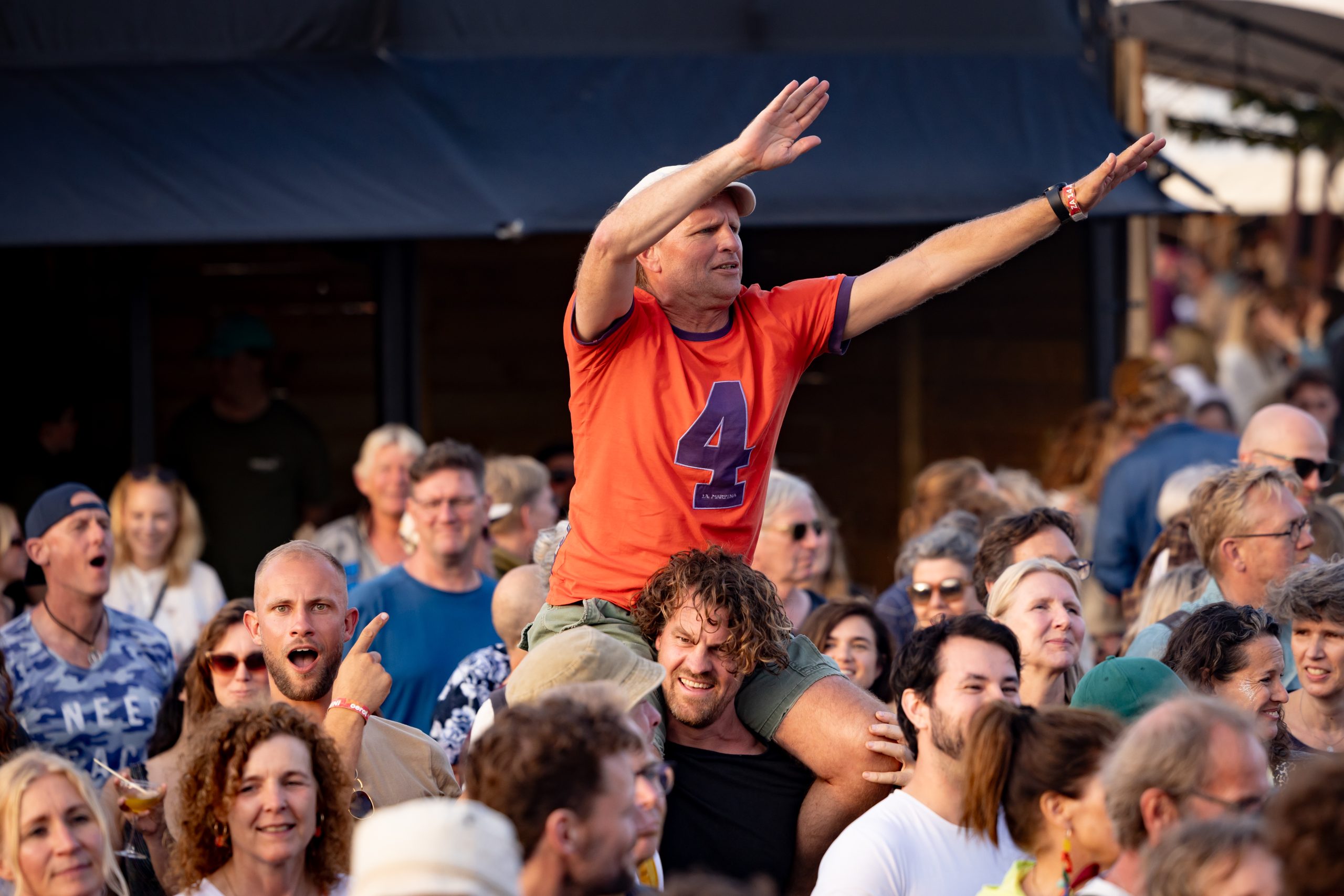 Man loopt door zittend publiek op festivalhart de Deining tijdens de opening van Oerol 2023