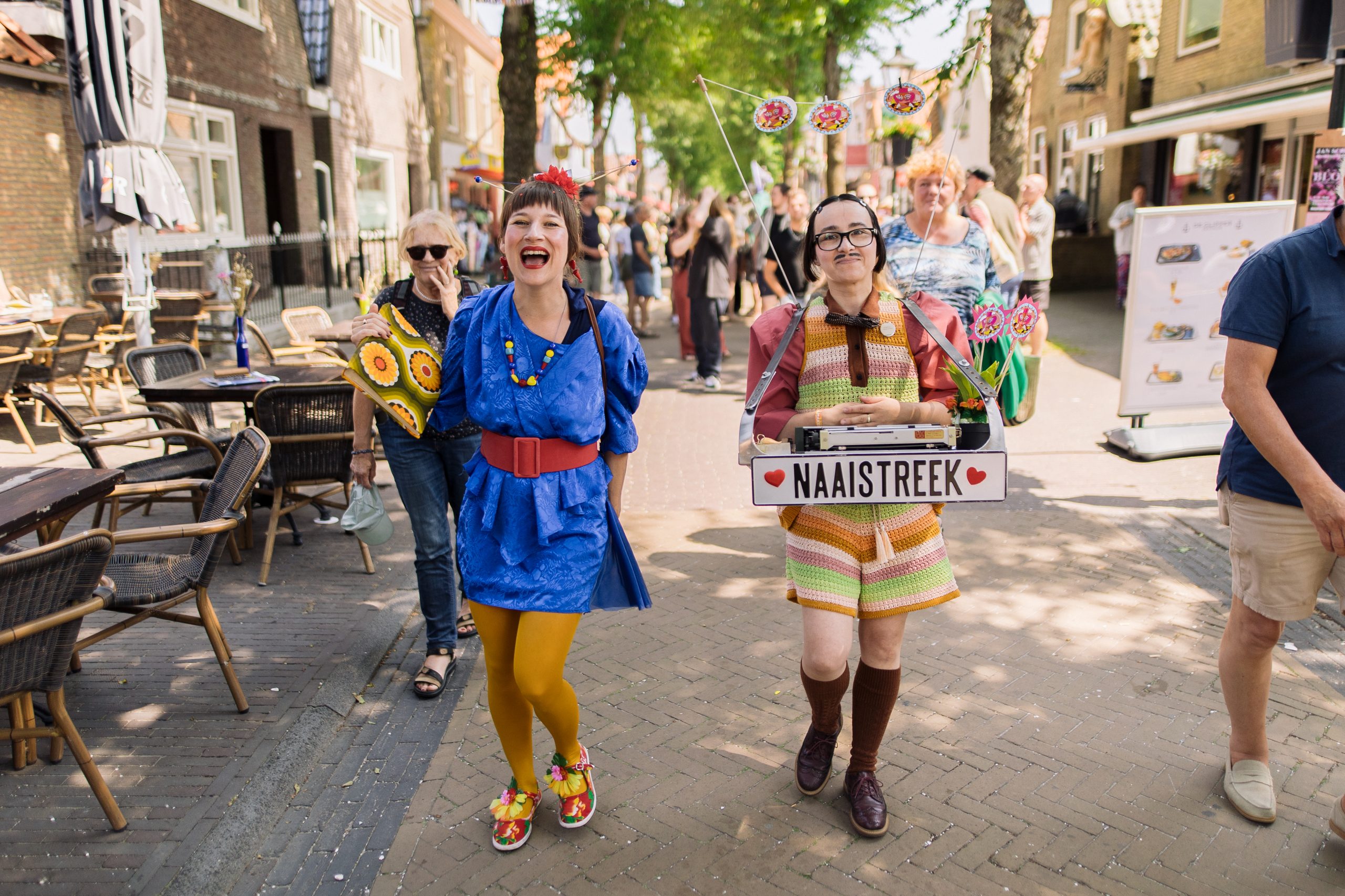 Twee dragqueens in fluoriserende kleding dansen tijdens straattheater in West Terschelling, collectief House of Fitness, Oerol 2023