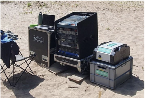 Ligt je speellocaties op maximaal 100 meter van een vaste stroomaansluiting met voldoende vermogen, dan zullen we gebruik maken van deze aansluiting. De charme van spelen op Oerol is nu echter net dat we graag spelen op plekken waar geen bebouwing in de buurt is. We zullen dus vaak naar alternatieven voor de stroomvoorziening moeten kijken om toch een mooie voorstelling te kunnen maken. Allereerst zullen we kritisch kijken naar de hoeveelheid stroom die echt nodig is om een mooie voorstelling neer te kunnen zetten. Waar mogelijk zullen we daarbij voor alternatieven kiezen waarbij ter plekke geen stroom nodig is. Bijvoorbeeld; het zetten van koffie en thee hoeft helemaal niet op locatie, maar kan ook door middel van thermoskannen van de accommodatie naar locatie gebracht worden (of schuif voor een bakkie aan bij een van de vele horecazaken op het eiland). Ook zullen we voor groepen die bij daglicht buiten spelen in beginsel geen stroom leveren voor verlichting.